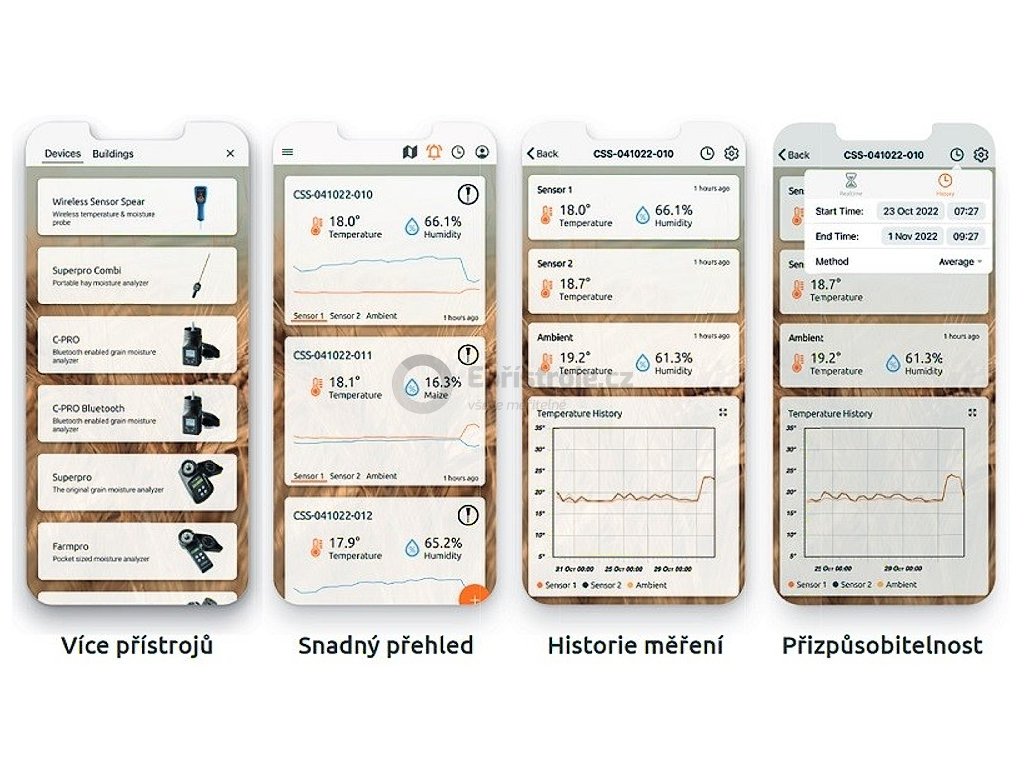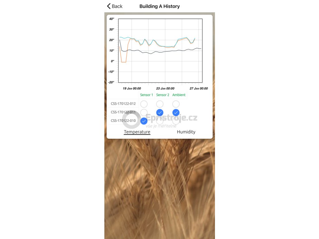 Aplikace vám poskytne náhled trendu naměřených hodnot (teploty a vlhkosti) v reálném čase a také pohled na všechny vaše senzory. Můžete nastavit úroveň alarmů, typu plodiny, teploty a vlhkosti. |