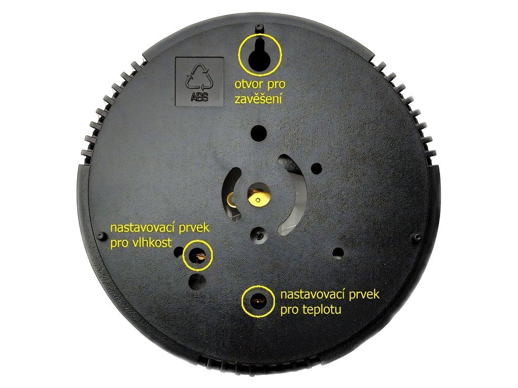 - Vlhkoměr disponuje nastavovacími prvky jak kalibraci relativní vlhkosti tak pro kalibraci teploty (viz. obrázek)