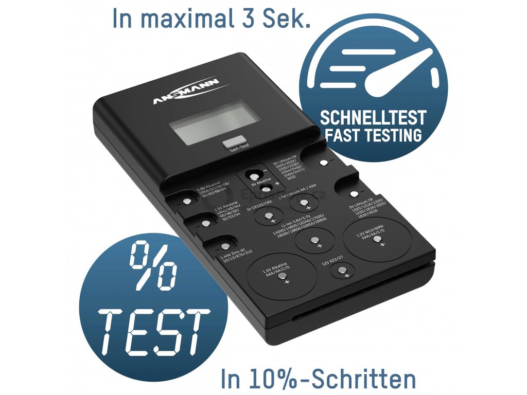 Pomocí jednoduchého připojení kontaktu testované baterie/akumulátoru se během několika málo sekund zobrazí skutečný obsah energie článku baterie po 10% krocích.