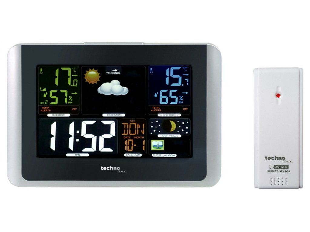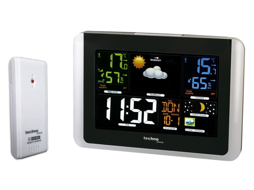 Meteorologická stanice s inverzním barevným displejem s časem a datem řízenými rádiovým signálem DCF-77, budíkem, měřením vnitřní teploty, relativní vlhkosti a absolutního barometrického tlaku, bezdrátovým čidlem pro měření vnější teploty a relativní vlhkosti.