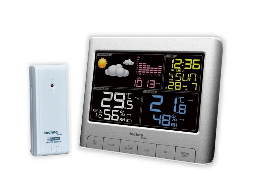 Meteorologická stanice s inverzním barevným displejem s časem a datem řízenými rádiovým signálem DCF-77, budíkem, měřením vnitřní teploty, relativní vlhkosti a absolutního barometrického tlaku, bezdrátovým čidlem pro měření vnější teploty a relativní vlhkosti.