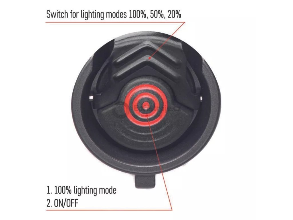 Druhé tlačítko je připraveno pro rychlou změnu režimu svícení, kdy můžete volit mezi 100% výkonem svítilny, při níž svítilna dosvítí na vzdálenost až 230 m, 50% režimem svícení s dosvitem až 150 m, nebo úsporným 20% režimem svícení, jehož dosvit dosahuje až 100 m.