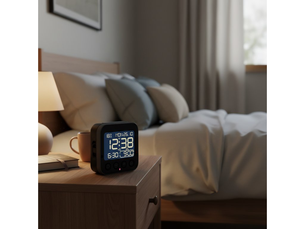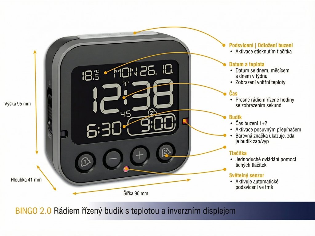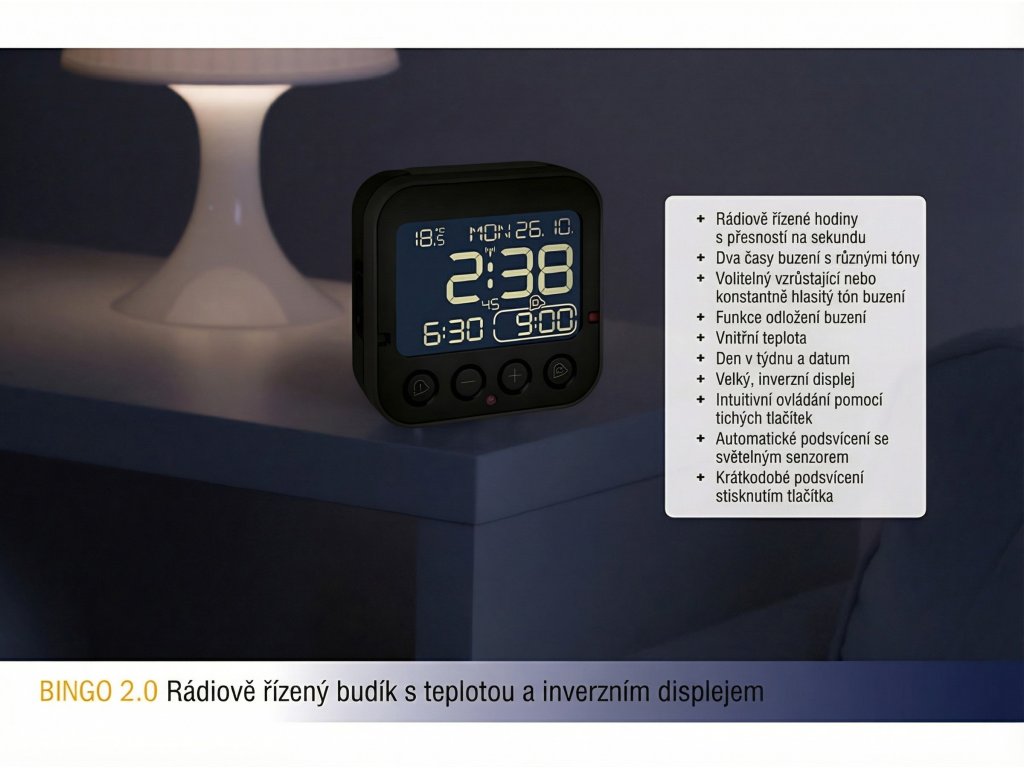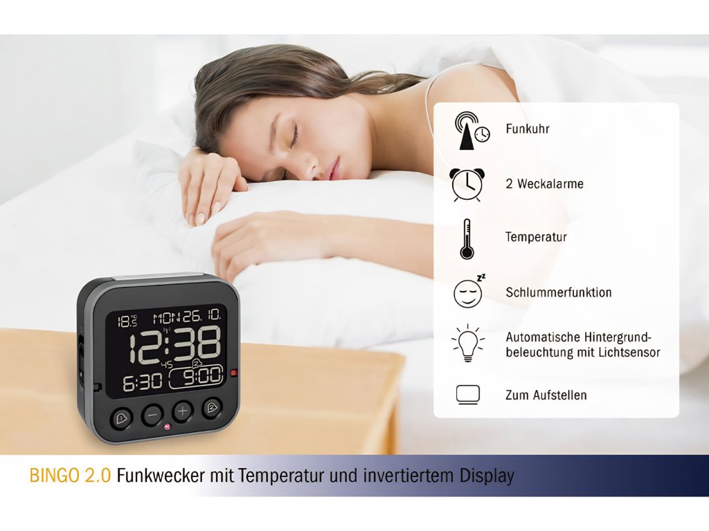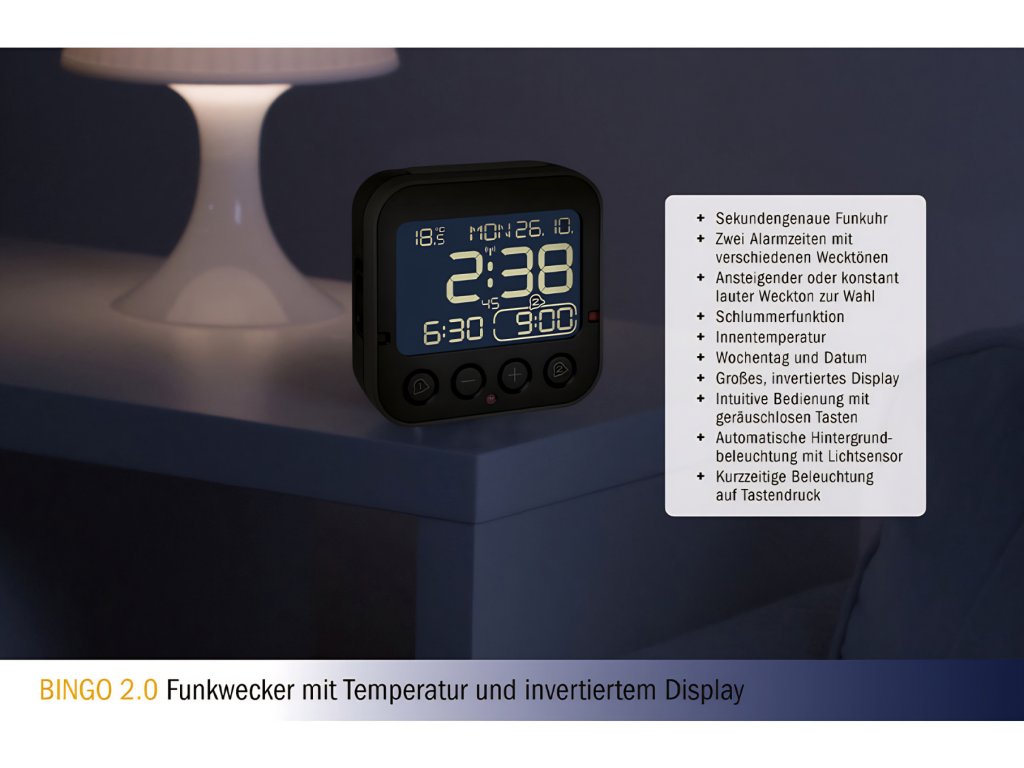 Rádiem ovládaný budík s rozsáhlými funkcemi, ale bez zbytečných vychytávek. Stejně jako jeho menší sourozenec je i rádiem ovládaný budík BINGO 2.0 intuitivní a snadno se používá. Velký, invertovaný displej je ještě jasnější a snadno čitelný, a to i ve tmě. Stisknutím velkého tlačítka na horní straně hodin se krátce rozsvítí. Pro ty, kteří chtějí vidět čas celou noc, je k dispozici také diskrétní a energeticky úsporné noční světlo, které se automaticky zapíná a vypíná pomocí integrovaného světelného senzoru.