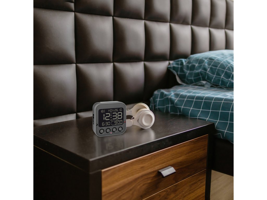Dva časy buzení s různými zvuky buzení lze aktivovat nezávisle na sobě. Jednoduše posuňte příslušný přepínač na boku nahoru. Barevný indikátor jasně ukazuje, zda je budík zapnutý. Probuďte se jemně s postupně se zvyšujícím tónem budíku nebo okamžitě s plnou hlasitostí. Pokud se vám nechce hned vstávat, použijte funkci odložení buzení.