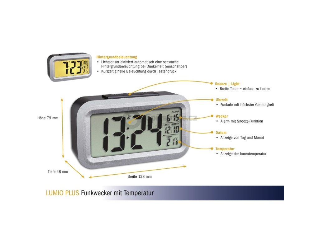 Přednosti budíku je především velký a přehledný displej, dále pak rádiem řízené hodiny, které budou vždy ukazovat přesný čas a v neposlední řadě i měření teploty vzduchu v místnosti.