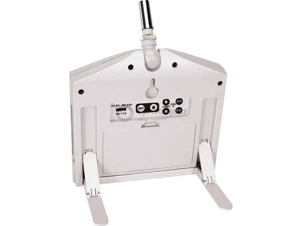 Ideální přístroj ke sledování hlasitosti hluku a zvuku v budovách, v kancelářích, ve výrobních závodech (atd.). Tento hlukoměr je vybaven nastavitelnou funkcí alarmu, pomocí které lze zkontrolovat dodržování zákonem stanovených úrovní hluku a provést případná opatření. Kromě toho se hodí tento přístroj i ke kontrole hlasitosti řečníků, například na přednáškách nebo na schůzích. V případě optimální hlasitosti, se rozsvítí na přístroji kontrolky (LED) zelenou barvou, bude-li hlučnost příliš vysoká nebo naopak příliš nízká, začnou svítit nebo blikat kontrolky (LED) červenou barvou, toto upozorní například přednášejícího, aby snížil nebo zvýšil svůj hlas. Signalizaci alarmu poznáte opticky podle super jasných LED. Tato signalizace alarmu je k dispozici i na analogovém spínacím výstupu hlukoměru.