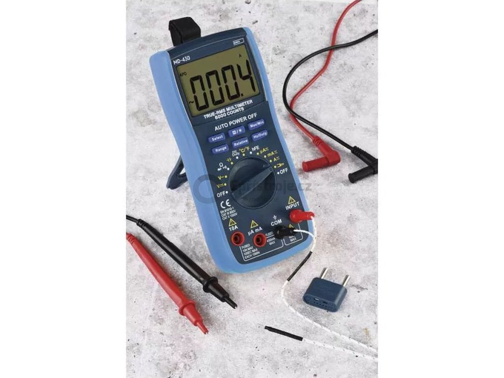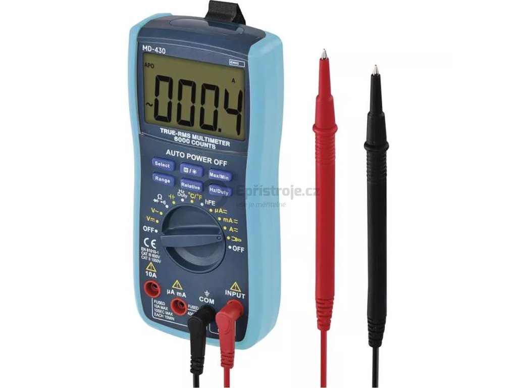 Práce ve zhoršených světelných podmínkách nejsou pro uživatele multimetru MD-430 díky jeho podsvícenému displeji žádnou překážkou. Velký rozsah měřeného AC/DC proudu i napětí dělají z tohoto multimetru skutečně univerzálního pomocníka. Díky funkci True RMS dokáže přístroj přesně změřit efektivní hodnoty libovolných střídavých nesinusových signálů proudu a napětí. Navíc je při nastavování rozsahu měření možné využít manuální a automatickou volbu rozsahu.