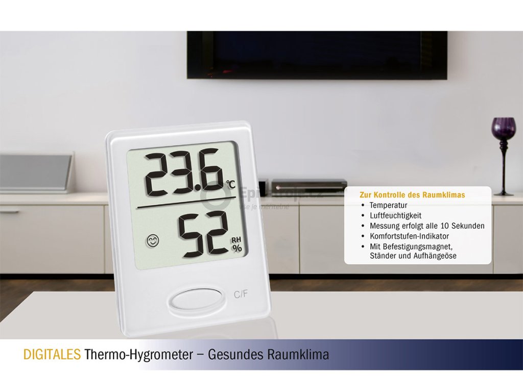 Tento teploměr s vlhkoměrem je ideálním měřicím přístrojem pro sledování klimatu v místnosti. Můžete snadno sledovat teplotu a vlhkost a regulovat je cíleným vytápěním a větráním, když jsou hodnoty mimo komfortní zónu. Pokud se zobrazí ikona smajlíka, hodnoty jsou ideální. To vytváří příjemné a zdravé životní prostředí a dokonce šetří náklady na vytápění. Praktický magnet usnadňuje jeho připevnění na kovové povrchy.