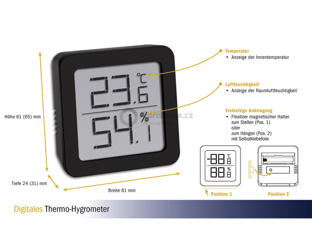 | Rozsah dodávky | 1x digitální teplo-vlhkoměr TFA 30.5051.01 1x nalepovací magnetický stojánek/držák |