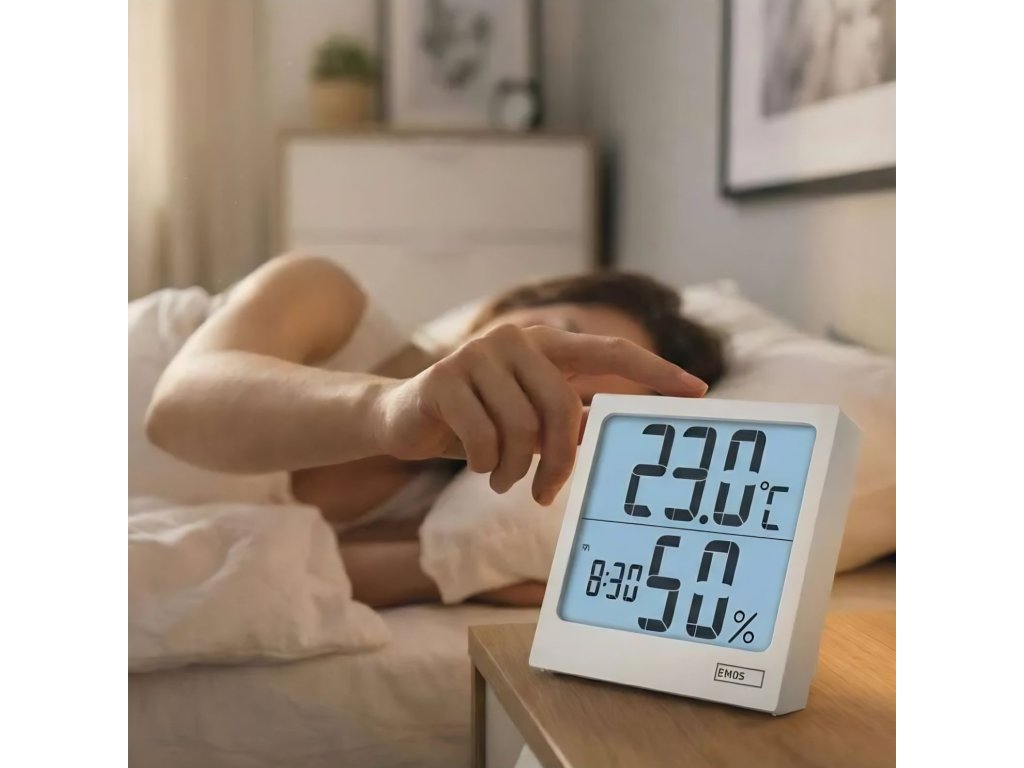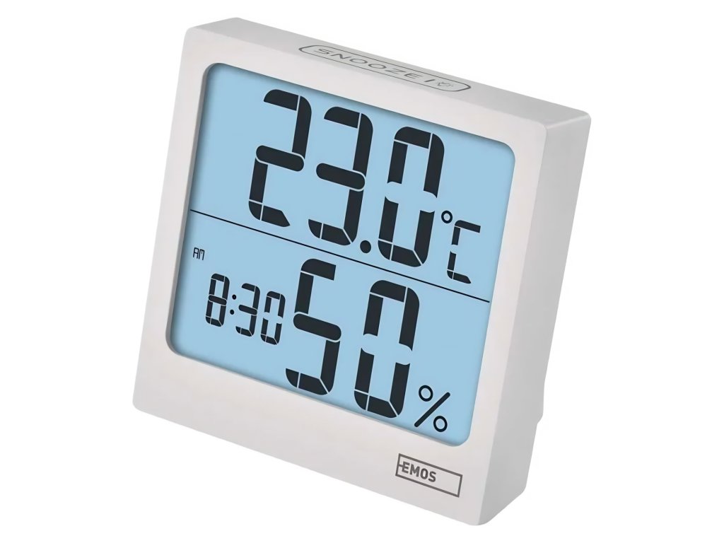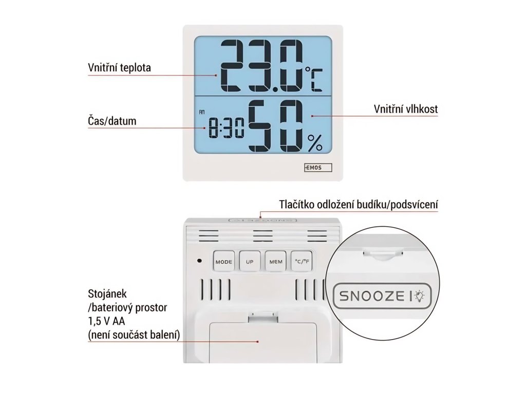 Nabízí komplexní řešení pro měření vnitřní teploty a vlhkosti. S kvalitními quartzovými hodinami, datem a zobrazením min/max teploty budete mít přehled o všech důležitých ukazatelích. Snadno lze přepínat mezi jednotkami °C/°F a využít můžete i praktickou funkci budíku s opakovaným buzením. Přehledný LED podsvícený displej s velkými číslicemi zajistí skvělou čitelnost. Displej není podsvícený trvale, stisknutím tlačítka SNOOZE aktivujete podsvícení na 5 sekund a pak se displej vrátí do úsporného režimu.