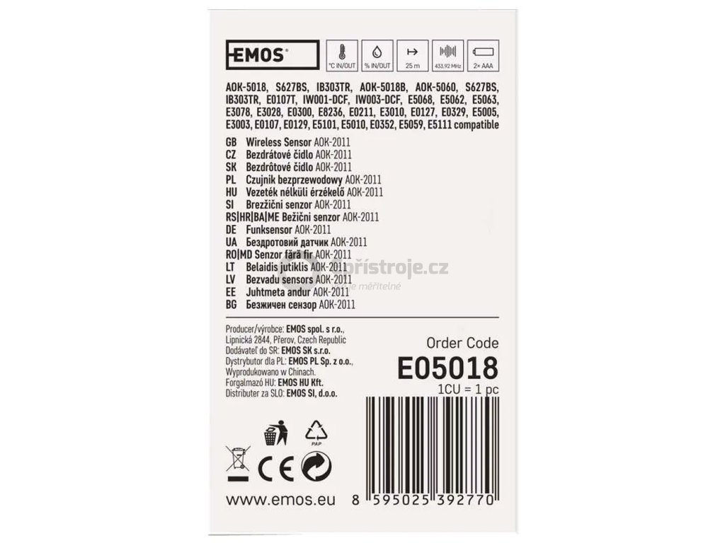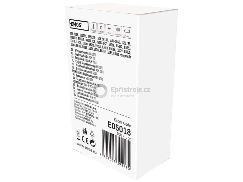 Toto teplotně-vlhkostní bezdrátové čidlo slouží jako náhradní díl za případně rozbité/nefunkční čidlo pro meteostanice EMOS AOK-5018B, AOK-5060, S627BS, IB303TR, E0107T, IW001-DCF, IW003-DCF, E5068, E5062, E5063, E3078, E3028, E0300, E8236, E0211, E3010, E0127, E0329, E5005, E3003, E0107, E0129, E5101, E5010, E0352, E5111, E8636, E0316, E5080, E8614.