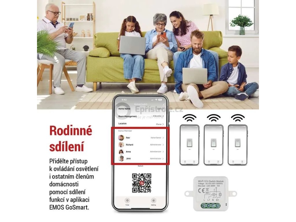 - Další funkce: tvorba scén, seskupování zařízení, časovač, rodinné sdílení