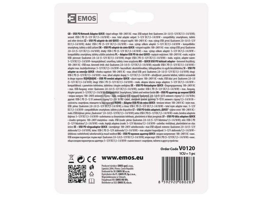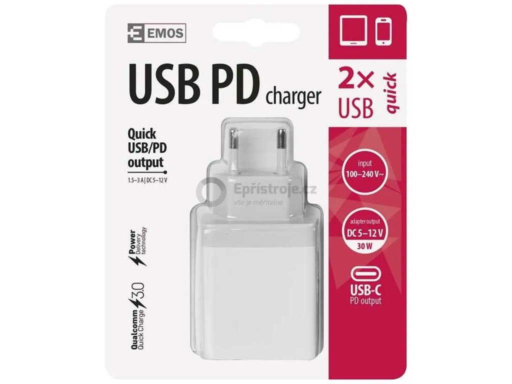 Emos V0120 | Univerzální 2x USB adaptér PD do sítě 1,5-3,0A (30W) max.