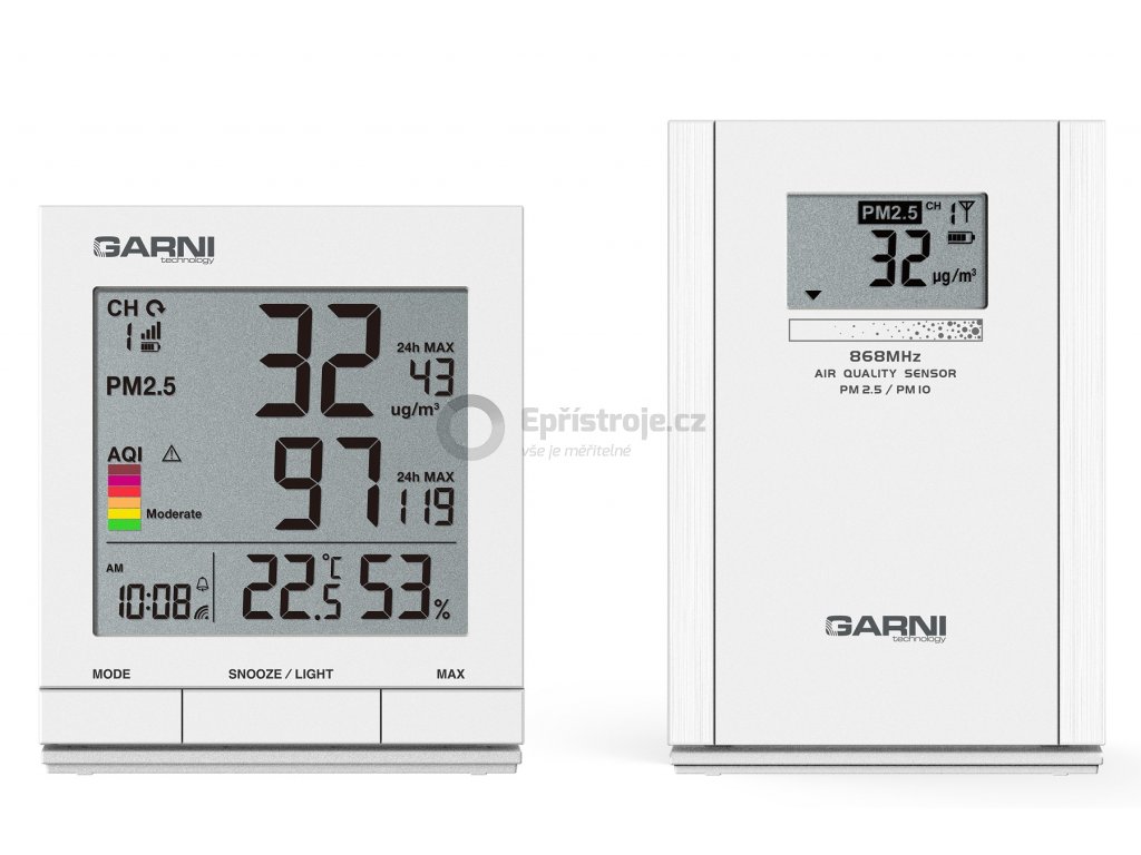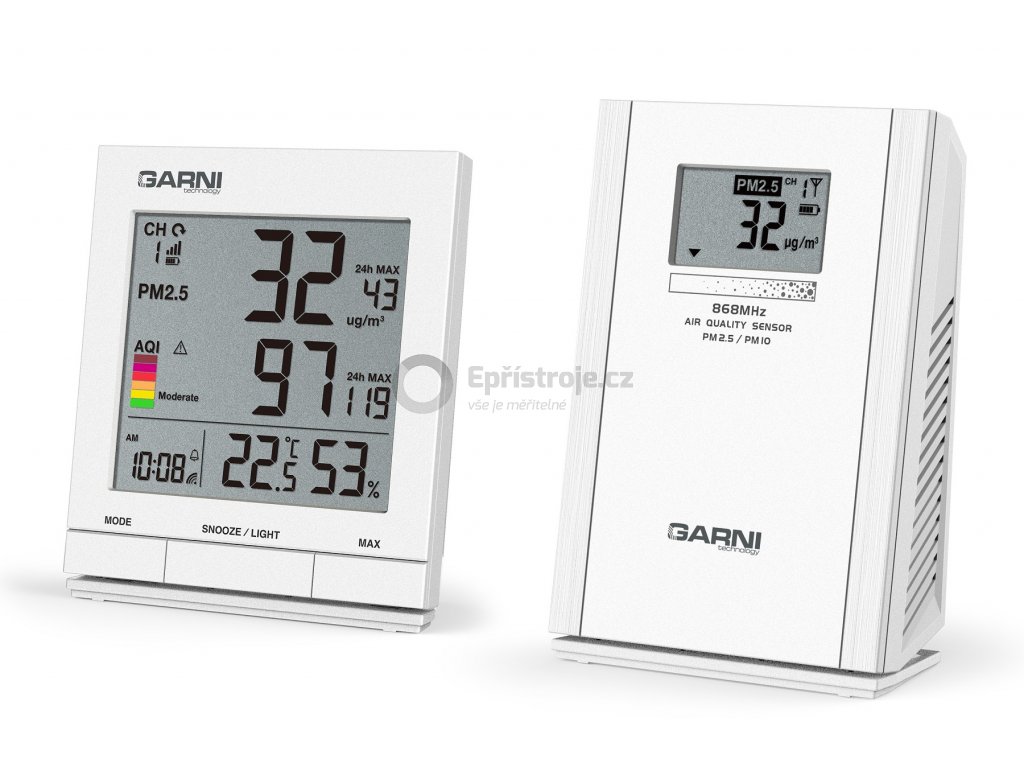 - hlavní jednotka měří teplotu a relativní vlhkost a zobrazuje hodnoty pevných částic PM2.5, nebo PM10 naměřené bezdrátovým čidlem GARNI 104Q