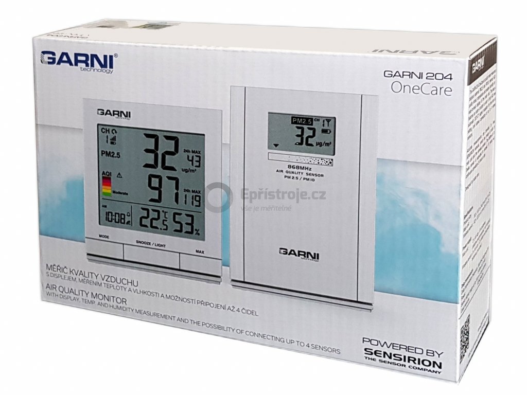 Měřič kvality vzduchu GARNI 204 OneCare je určen pro vnitřní použití. Měří a zobrazuje na svém LCD displeji hodnoty kvality vzduchu – koncentraci pevných částic PM2.5 a PM10 naměřenou bezdrátovým čidlem GARNI 104Q (jedno bezdrátové čidlo je součástí balení) a také teplotu a relativní vlhkost. Pro měření pevných částic (PM) je použito švýcarské čidlo SENSIRION řady SPS