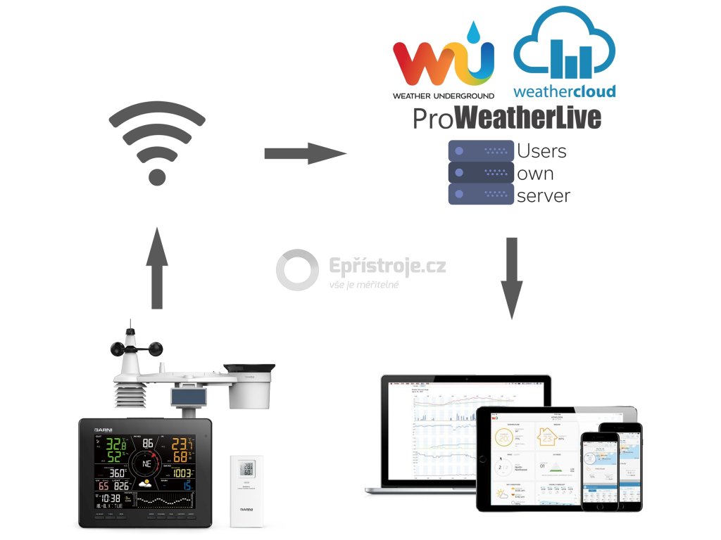 - přenos dat naměřených hlavní jednotkou a integrovaným čidlem 7-v-1 na server ProWeatherLive (PWL), Weather Underground, Weathercloud nebo vlastní server uživatele.