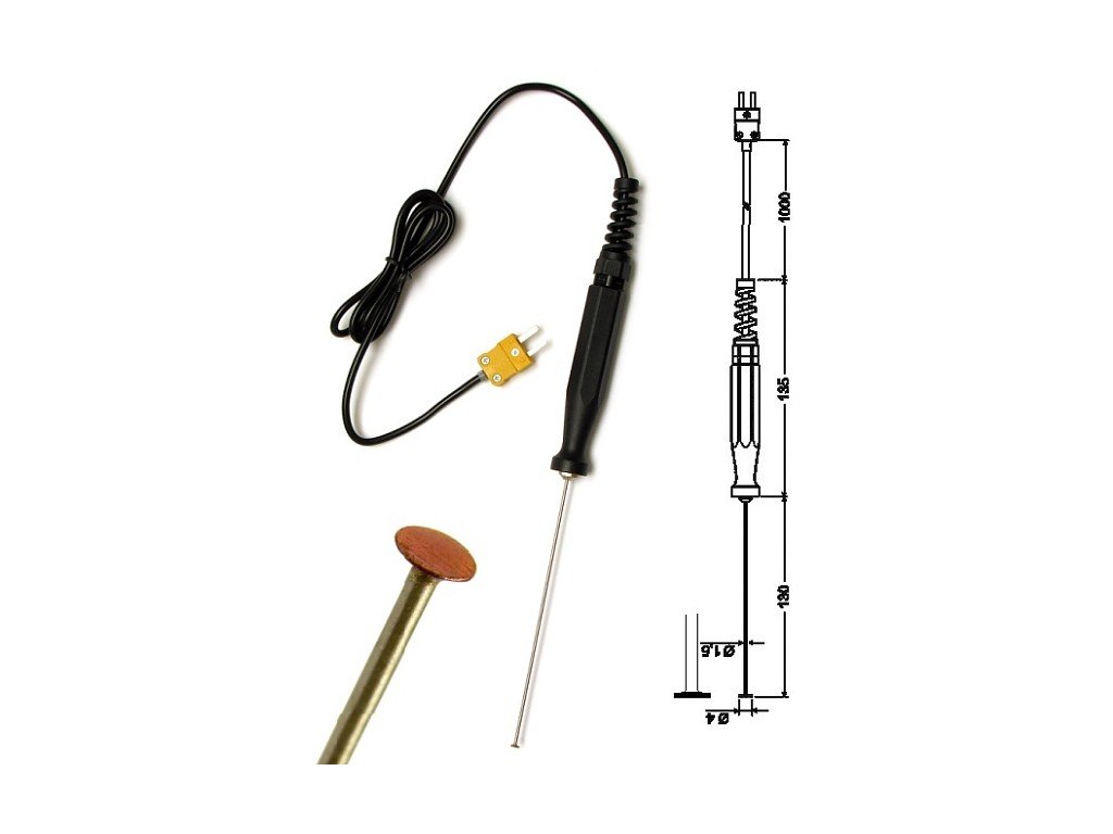 Tento termočlánek typu "K" je vhodný pro pevné povrchy všech druhů, pro vzduch a plyny (lze použít i pro měření teploty kapalin)