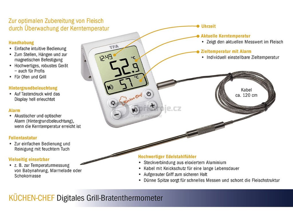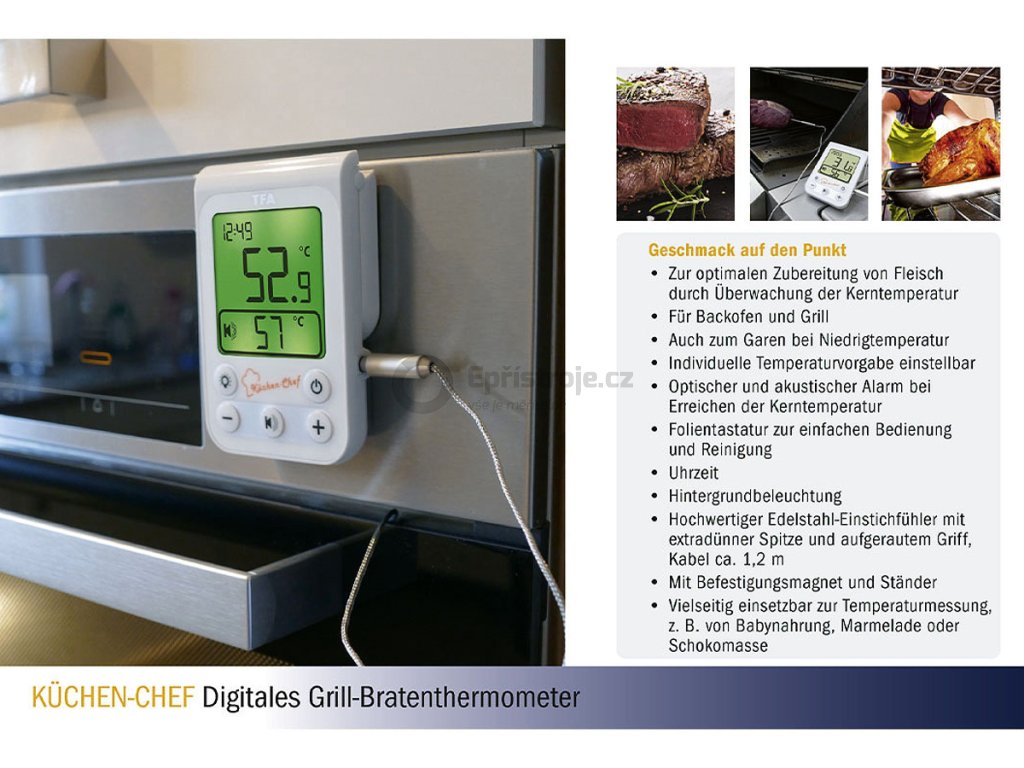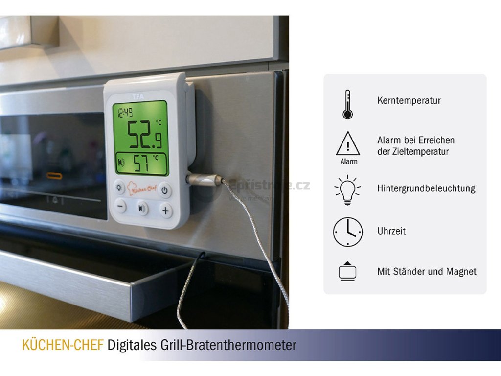 Umístěte nebo zavěste teploměr poblíž trouby. BBQ teploměr je snadno použitelný a snadno čitelný díky jasně osvětlenému displeji. „KÜCHEN-CHEF“ je také vhodný pro vaření při nízkých teplotách.