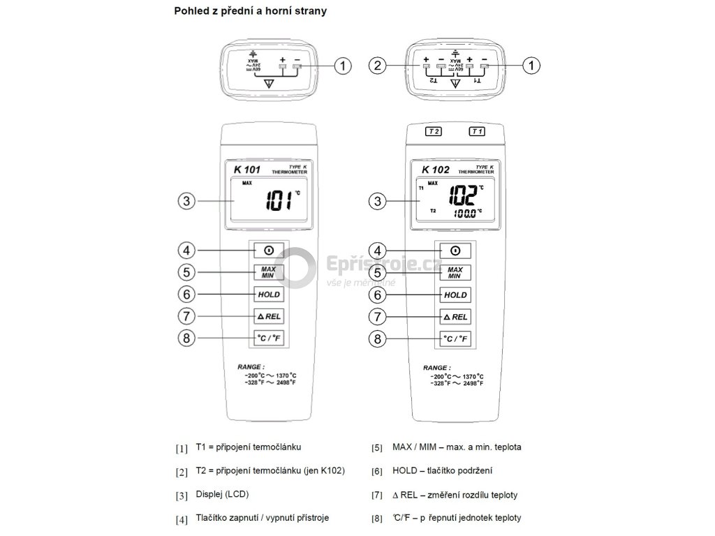 Rozsah teploměru: -65..+500°C, teplotní čidlo v třídě přesnosti 1. Termočlánek typu "K" (NiCr-Ni).