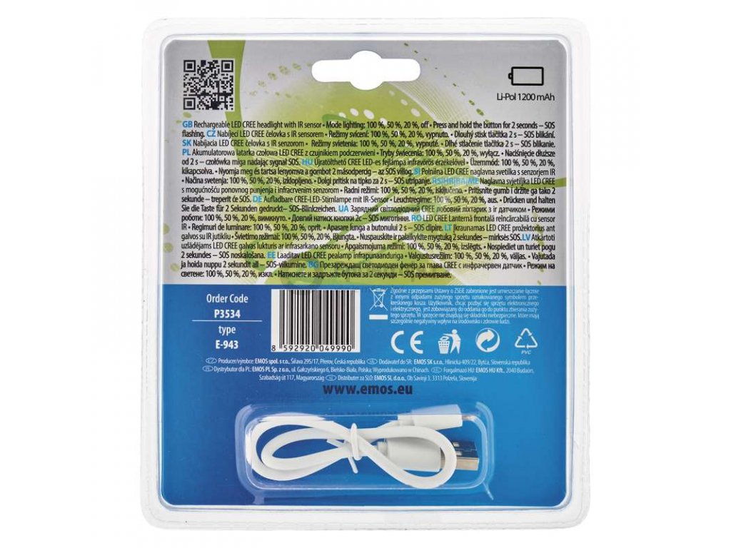 Tato čelovka má zabudovaný Li-Pol akumulátor, který je možné dobíjet přes kabel s micro-USB konektorem.