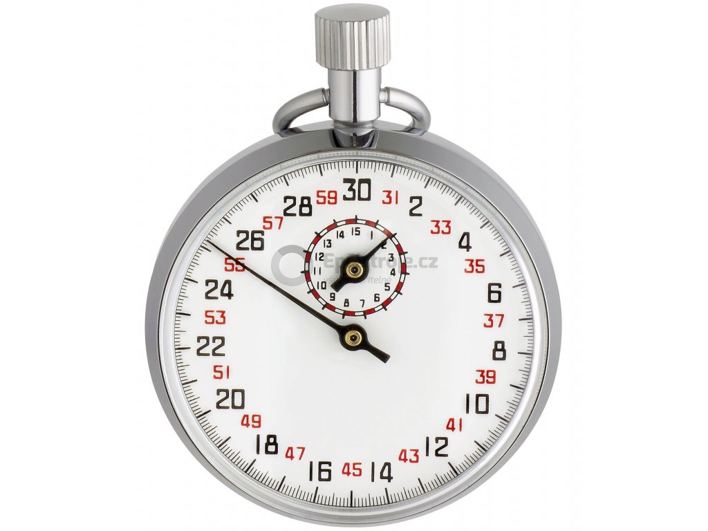 Stopky se natahují ručně a běží až 15 minut. Po zastavení můžete odečítat čas s přesností na 1/10 sekundy.