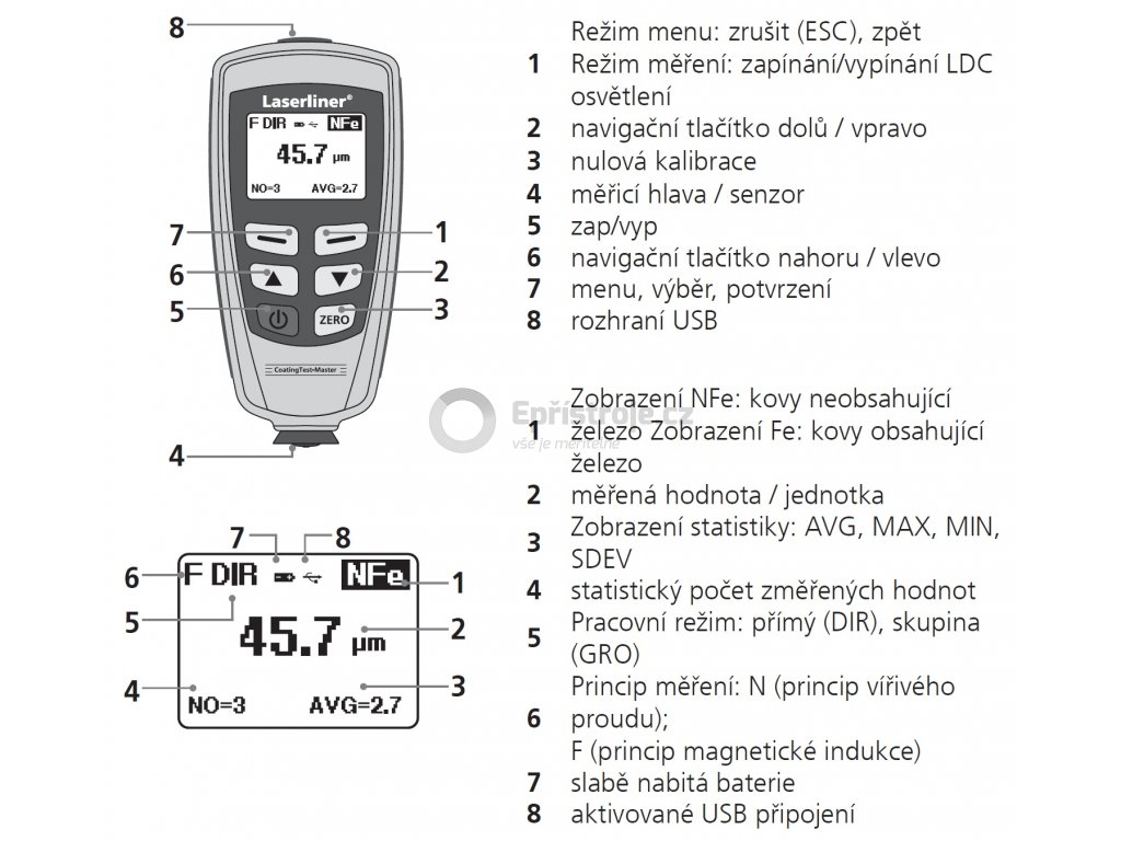 Tlušťkoměr je schopen měřit: nemagnetické povlaky (barva, zinek na oceli), izolační nátěry (barvy, eloxované povlaky) na neželezných kovech