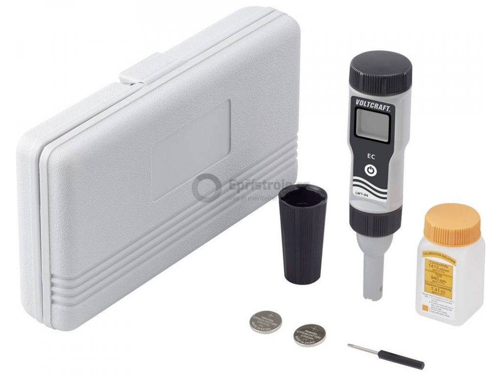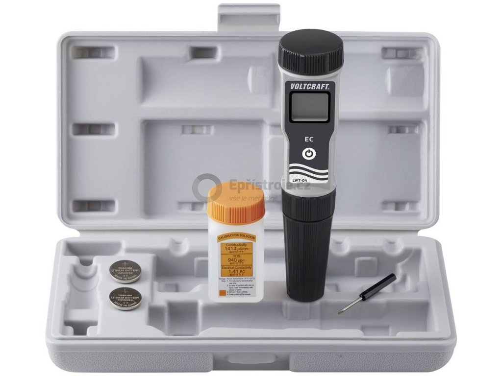 Rozsah dodávky | konduktoměr Voltcraft LWT-04 2x knoflíková baterie CR2032 1x kalibrační roztok 1413 μS 1x mini šroubovák ochranné pouzdro pro uložení |