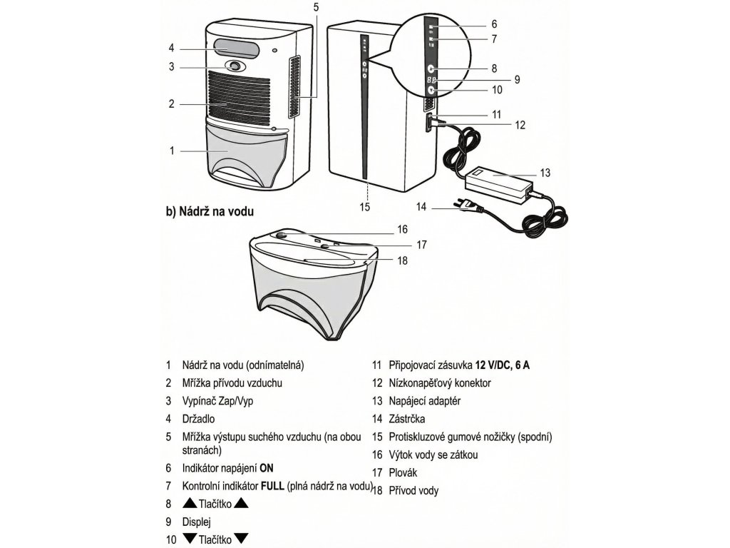 Kontrolka LED nádržky se rozsvítí a zůstane svítit. Odvlhčovač přestane automaticky fungovat. V tomto okamžiku je nutné vyjmout nádržku na vodu, vypustit nahromaděnou vodu, nádržku znovu vložit a tím restartovat zařízení, aby mohl provoz odvlhčování vzduchu pokračovat.