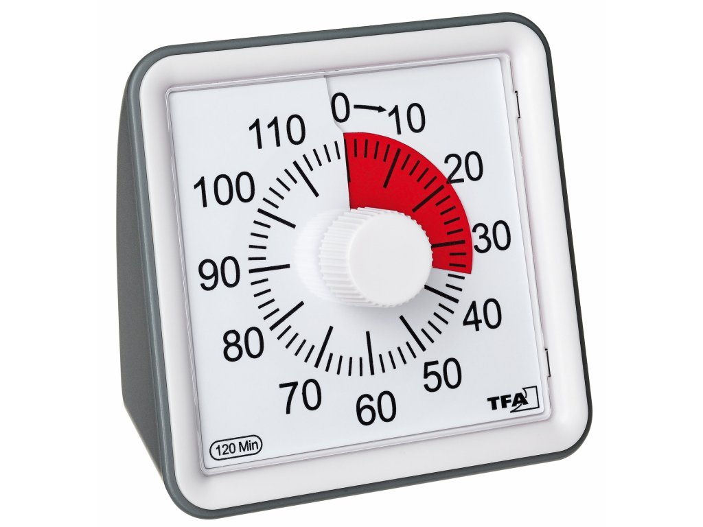 Jak název napovídá, VISUAL Timer zobrazuje plynutí času barevnou stupnicí. Jakmile otočným knoflíkem nastavíte požadovanou dobu, od jedné minuty do maximálně 120 minut, zobrazí se červená výseč se zbývajícím časem. Během odpočítávání vždy jasně vidíte, kolik času zbývá. Na konci zazní signál, který trvá dle potřeby 3 nebo 60 sekund. Hlasitost lze také nastavit ve dvou úrovních.