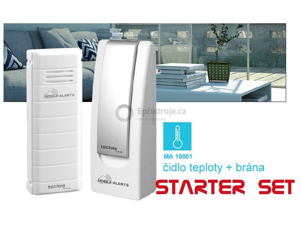 Startovací sada MA10001 obsahuje bránu (model MA10000) a bezdrátové čidlo pro měření teploty (model MA10100).