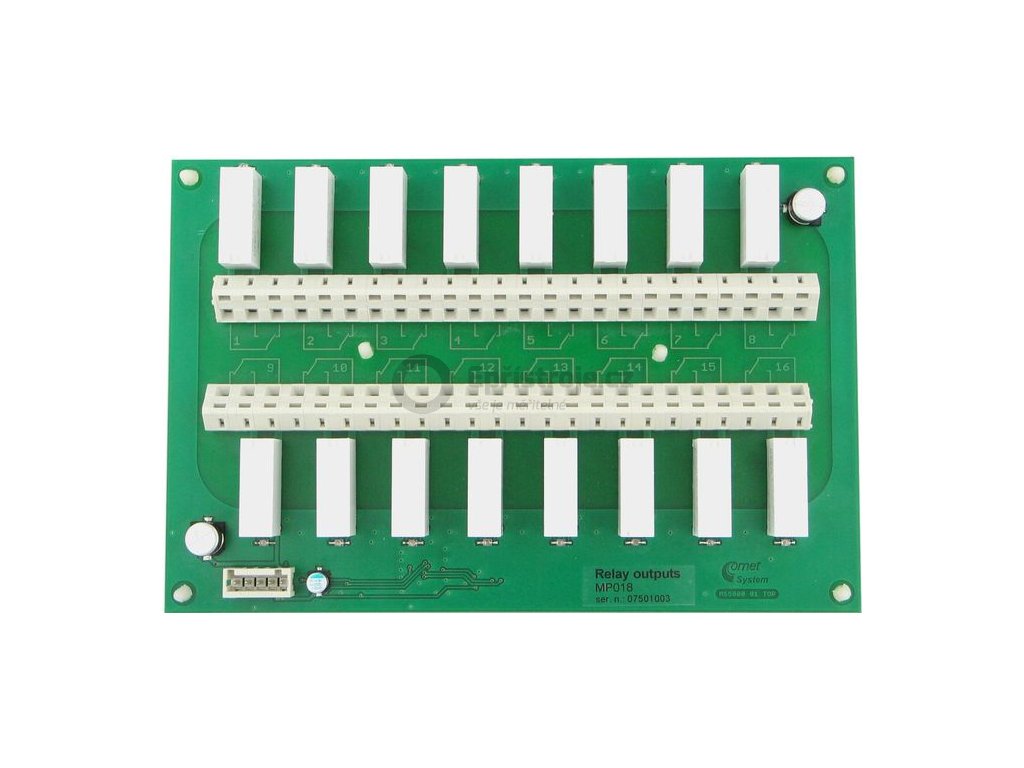 Modul výstupních relé. Obsahuje 16 síťových relé 250V/8A s přepínacím kontaktem, z nichž každé může být spínáno na základě vzniku jednoho nebo více alarmů na různých vstupních kanálech podle nastavení pomocí obslužného programu.