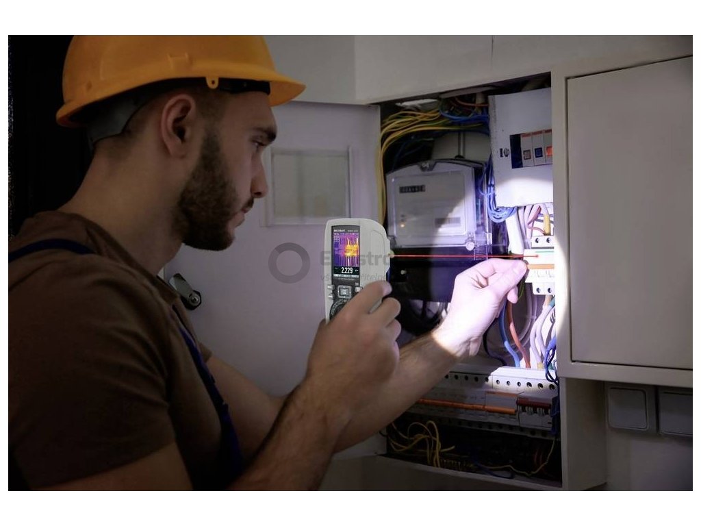 Integrovaná termokamera ukazuje rychle a snadno teplotní anomálie a problematická místa. Měření teploty je bezdotykové. Díky tomu jste v bezpečí především při měření teploty u zařízení, kterých se nelze bezpečně dotknout, jako jsou např. vysokonapěťová zařízení a transformátory, nebo u dílů, jako jsou pojistky, kabely, konektory a spínače.