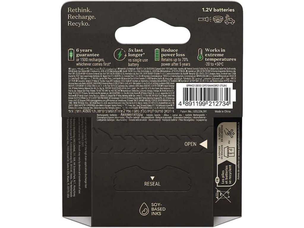 Baterie ReCyko Pro vybalíte a můžete ihned použít. Nemusíte se starat o jejich první nabití ani se obávat nízkého výkonu kvůli dlouhodobému uskladnění v prodejně. Baterie GP jsou totiž již z výroby přednabité, patří k bateriím s nejvyšší běžně dostupnou výdrží na trhu a navíc jsou vybaveny schopností udržet si po dlouhou dobu svou energii. Narozdíl od jiných baterií na trhu navíc disponují uváděnou kapacitou již po zakoupení.