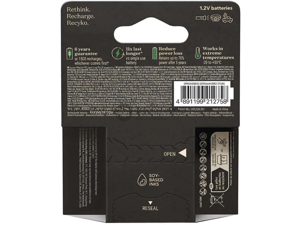 Kromě toho, že jsou baterie ReCyko plně spolehlivé a vydrží více než 1000 cyklů nabití a vybití, aniž by to jakkoliv ovlivnilo jejich kapacitu, vás potěší i minimální ekologická zátěž. Baterie GP ReCyko jsou totiž vyrobeny tak, aby byly šetrné k životnímu prostředí. Při výrobě jsou využívány již recyklované zdroje. Recyklovatelná je i většina materiálů, ze kterých jsou baterie vyrobeny. Společnost GP navíc myslela i na ekologické papírové balení. Baterie GP jsou tak skvělým produktem pro všechny, kterým na přírodě záleží.