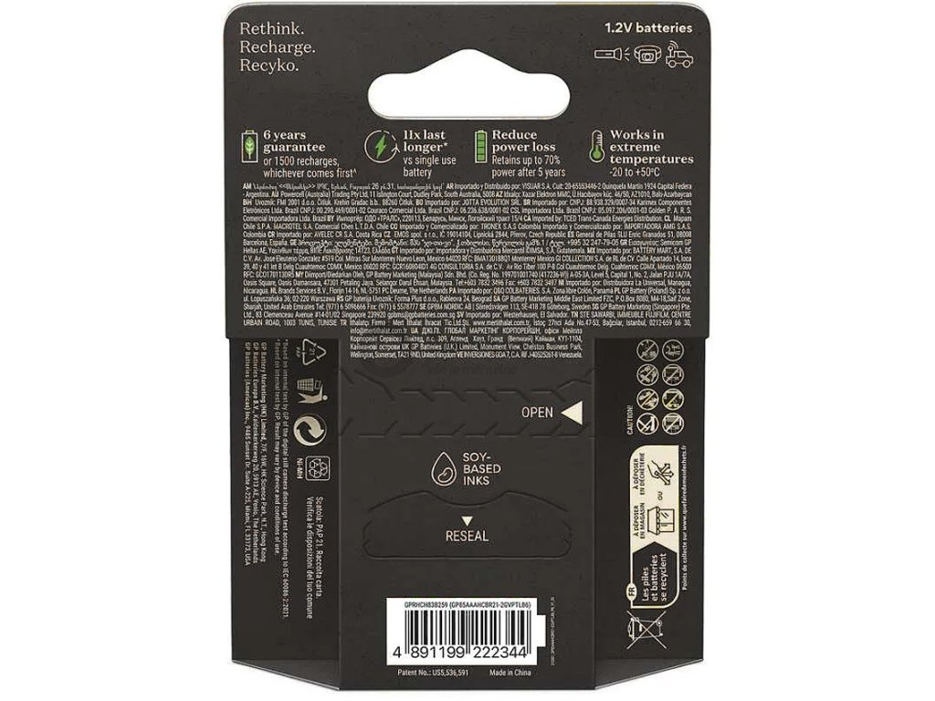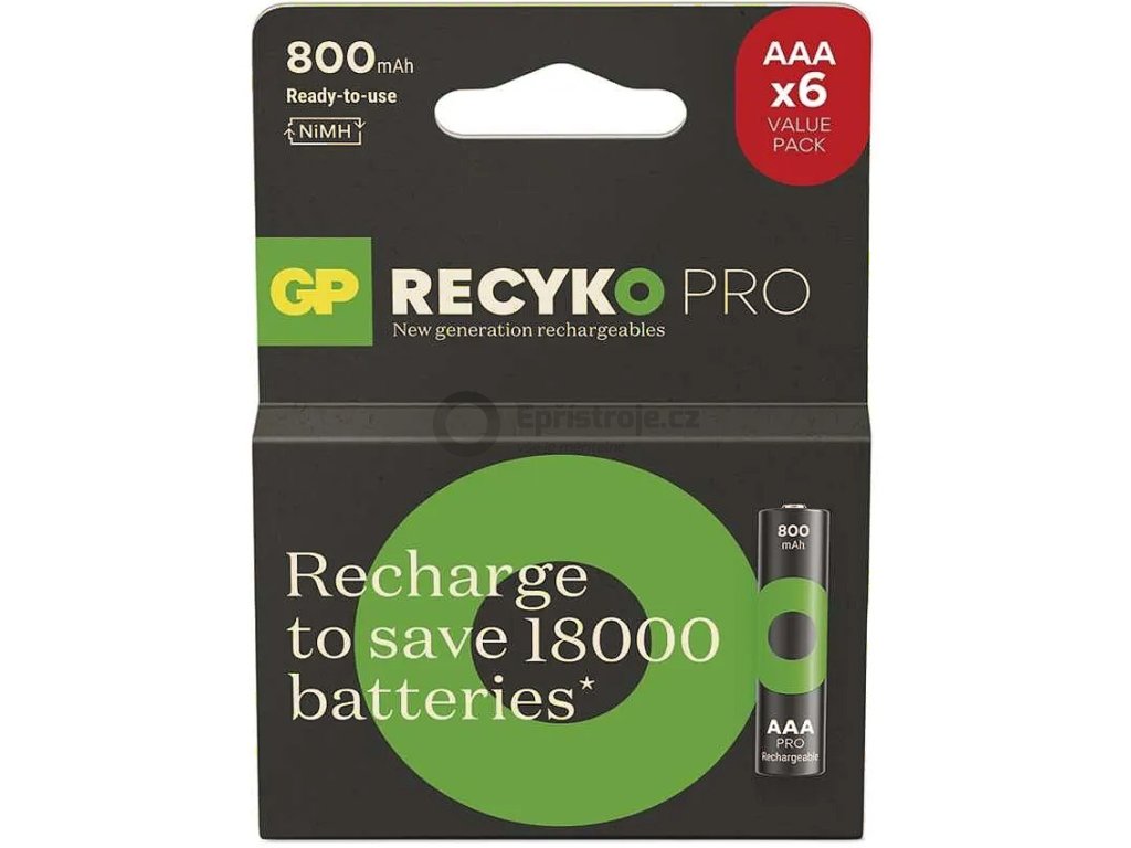 Baterie ReCyko Pro vybalíte a můžete ihned použít. Nemusíte se starat o jejich první nabití ani se obávat nízkého výkonu kvůli dlouhodobému uskladnění v prodejně. Baterie GP jsou totiž již z výroby přednabité, patří k bateriím s nejvyšší běžně dostupnou výdrží na trhu a navíc jsou vybaveny schopností udržet si po dlouhou dobu svou energii. Narozdíl od jiných baterií na trhu navíc disponují uváděnou kapacitou již po zakoupení.