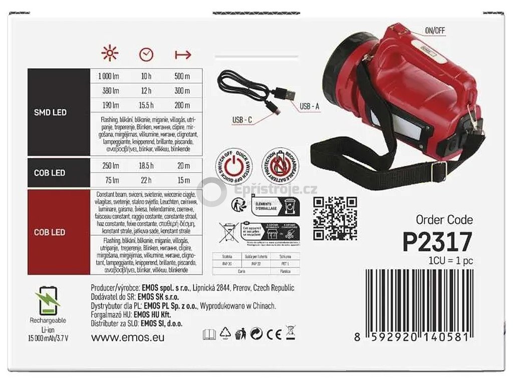P2317 | COB LED+LED nabíjecí svítilna Emos | 1000 lm | 15000 mAh | Li-Ion akupack