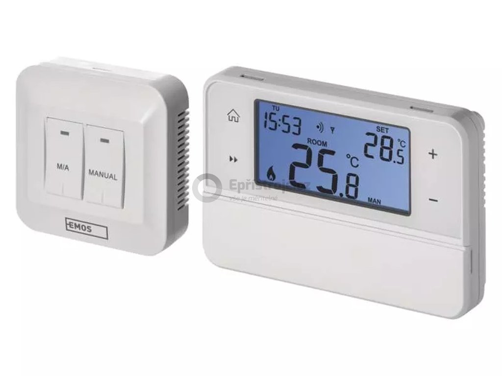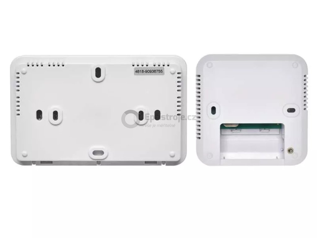 Bezdrátový termostat je napájen dvěma 1,5 V AA bateriemi. Na potřebu výměny baterie vás upozorní indikátor stavu baterie. Baterie jsou součástí balení stejně jako dva šroubky a dvě hmoždinky nutné k uchycení termostatu na stěnu.
