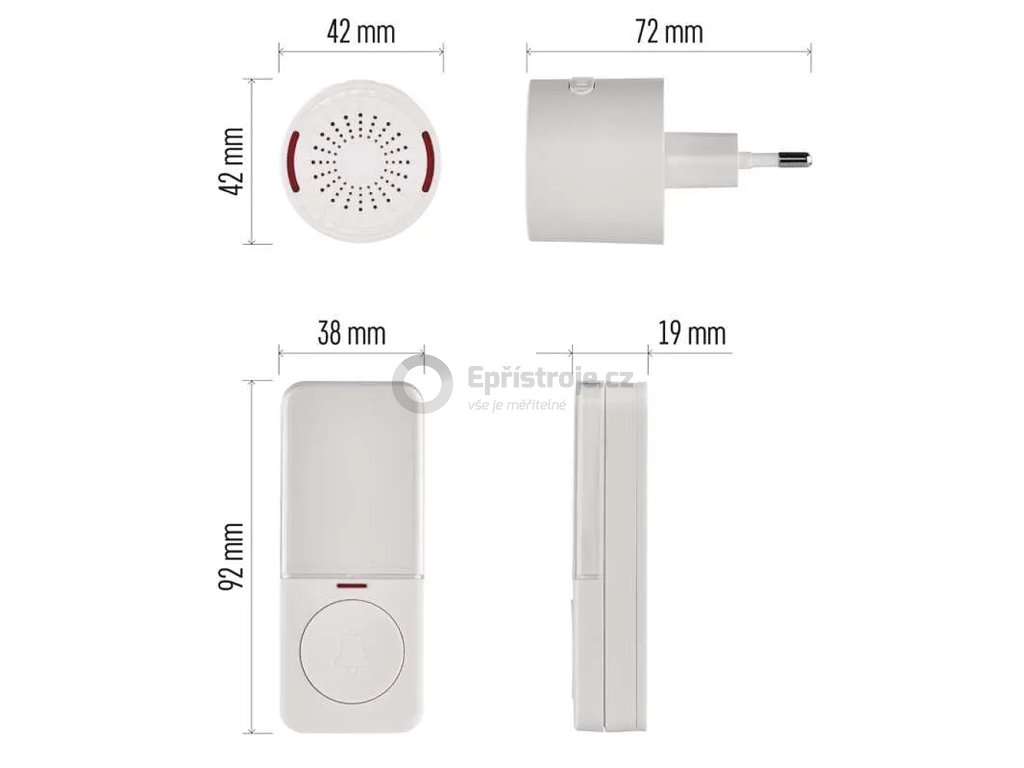 | Rozměry | zvonek: 72x 42 x 42 mm tlačítko: 19 x 38 x 92 mm |