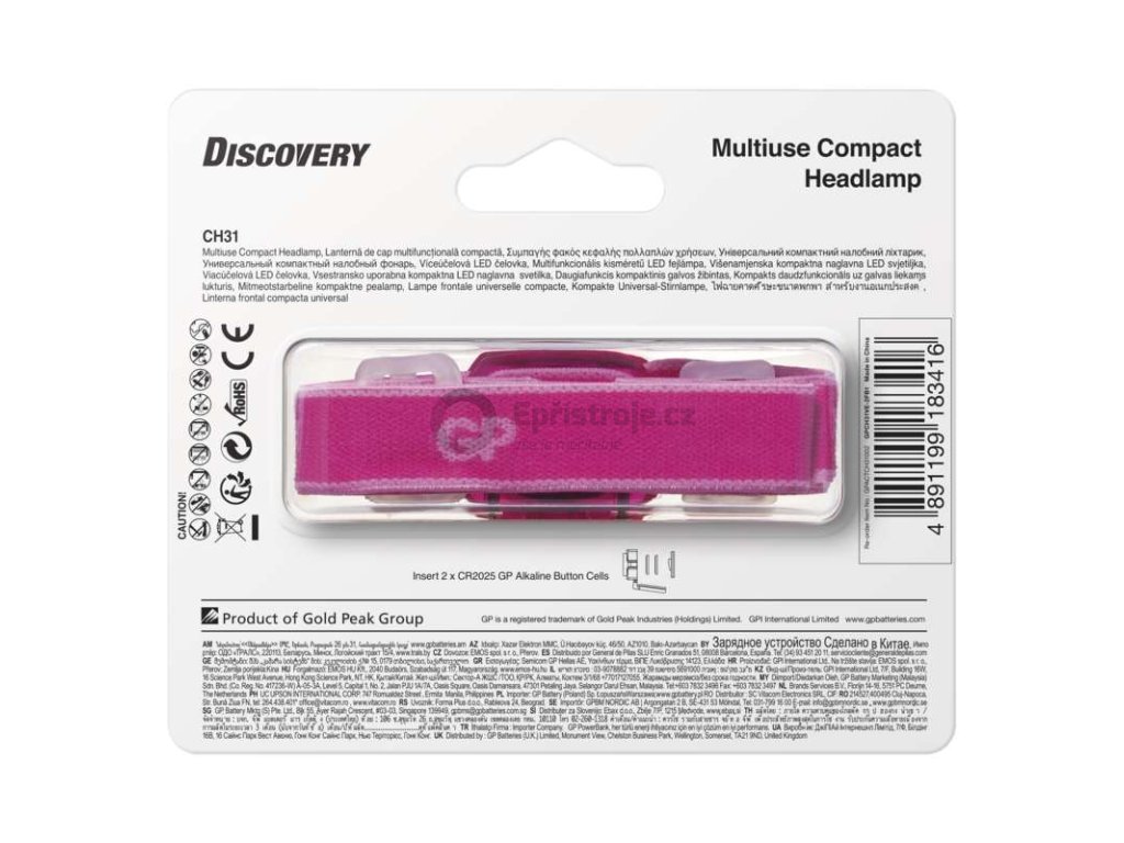 P8551P | LED čelovka GP CH31, 40 lm, 8m, 2× CR2025, RŮŽOVÁ