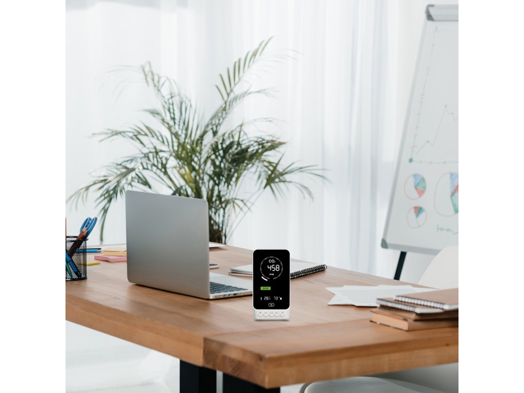 Výsledek: mnoho užitečných výsledků měření na první pohled. Jeho vysoce kontrastní displej a design pro chytré telefony dělají tento monitor CO2 jedinečným. Díky integrovanému stojanu je zařízení stabilní a lze jej postavit kamkoli.