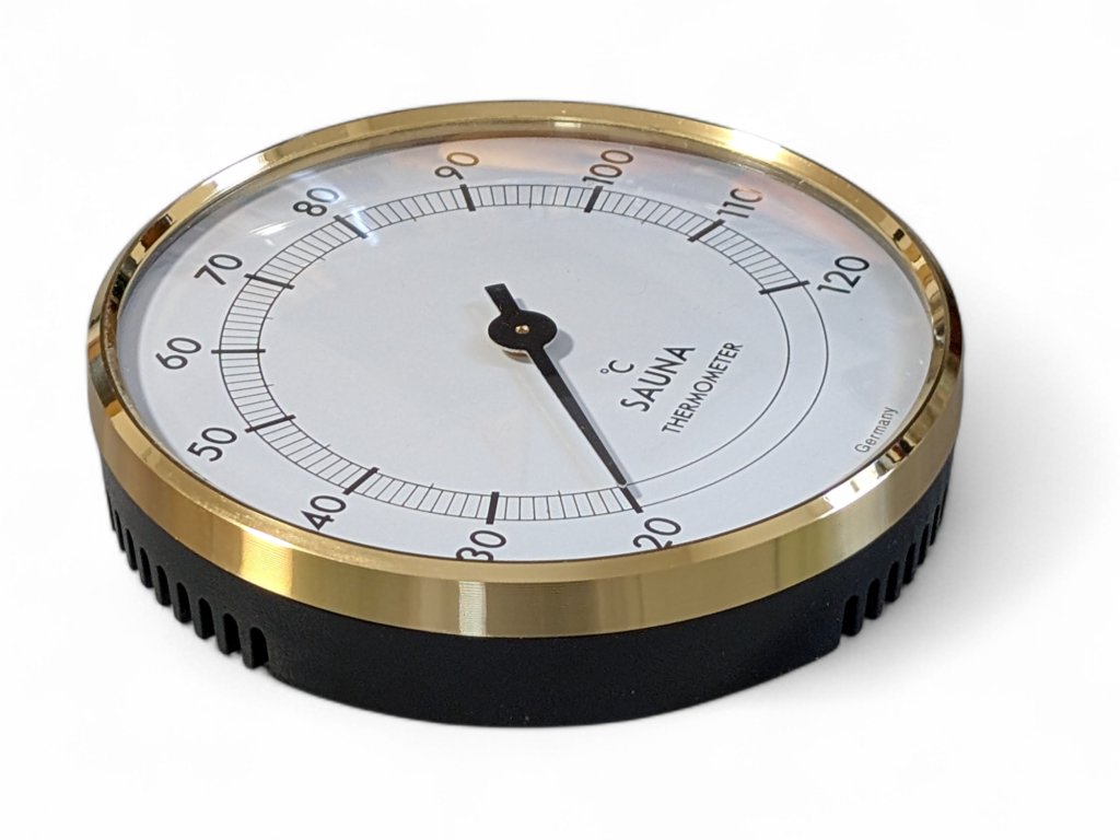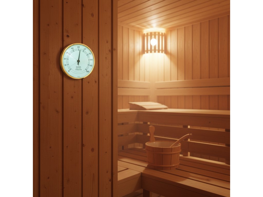 Teplo-vlhkoměr na kontrolu teploty a vlhkosti v sauně. Velký (120 mm) průměr teplo-vlhkoměru a barevná stupnice zajišťuje okamžitý odečet naměřené teploty.