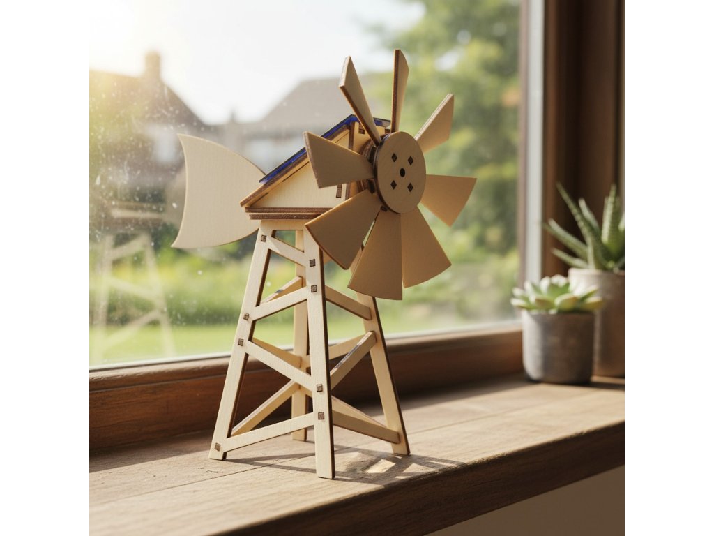 Solární mlýna je poháněn kvalitním solárním článkem. Pokud na solární článek dopadá dostatek světla, začnou se lopatky větrného mlýna otáčet. Nejmodernější technologie výroby propůjčuje tomuto modelu vysokou přesnost důležitou pro montáž. Jednotlivé díly jsou vyřezávané laserem. Samotné sestavení modelu solárního mlýna již představuje zábavu. Dřevěné díly (silné 3 mm) lze po smontování libovolně nabarvit.