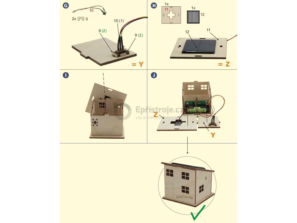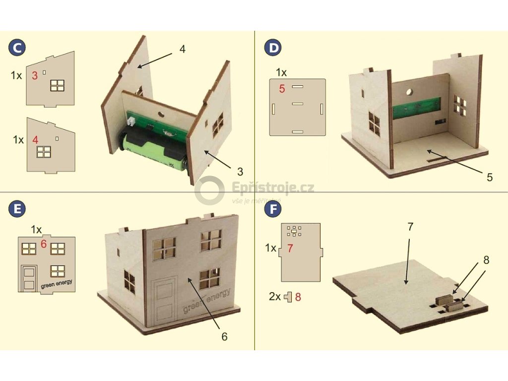 Solární domek se dodává jako stavebnice a díky podrobnému návodu jej lze velmi snadno sestavit. Solární článek upevněný na střeše zachycuje sluneční světlo a nabíjí tak akumulátor. Ten následně napájí zabudovanou LED, která se při setmění automaticky zapne. Přiložená deska je již připájena a je připojena ke spínači, LED a solárnímu panelu. Elektronické znalosti proto pro tuto stavebnici nejsou nutné. Stavebnice by měla spíše poskytnout pedagogicky cenné informace, které lze využít i v každodenním životě. Ideální pomůcka pro školy a mimoškolní instituce (různé zájmové kroužky), workshopy nebo jednoduše pro domácí sestavení skvělého modelu.