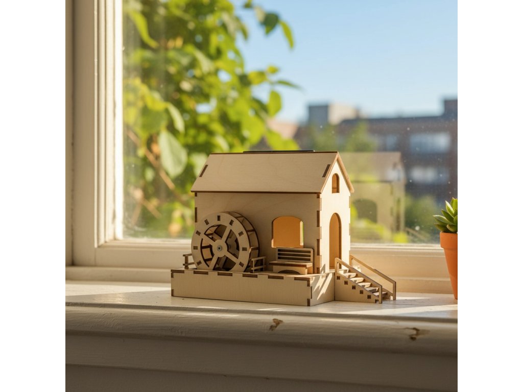 Solární mlýna je poháněn kvalitním solárním článkem. Pokud na něj dopadá sluneční záření, začne se vodní kolo otáčet. Nejmodernější technologie výroby propůjčuje tomuto modelu vysokou přesnost důležitou pro montáž. Samotné sestavení modelu solárního mlýna již představuje zábavu. Dřevěné díly (silné 3 mm) lze po smontování libovolně nabarvit.