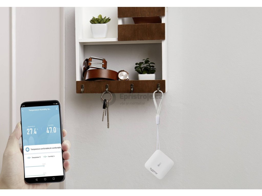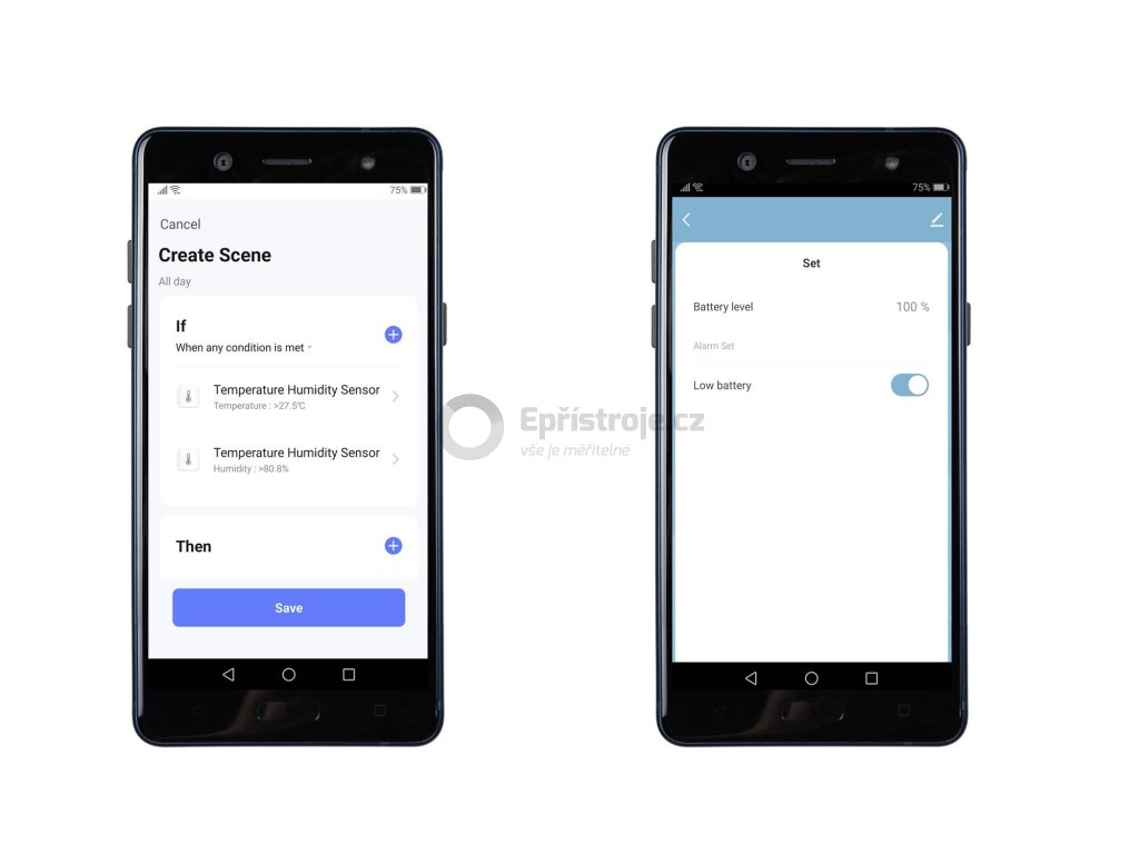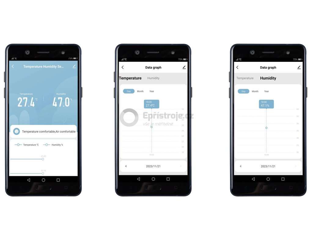 - Okamžité upozornění v aplikaci v případě nastavení ALARMu teploty a vlhkosti