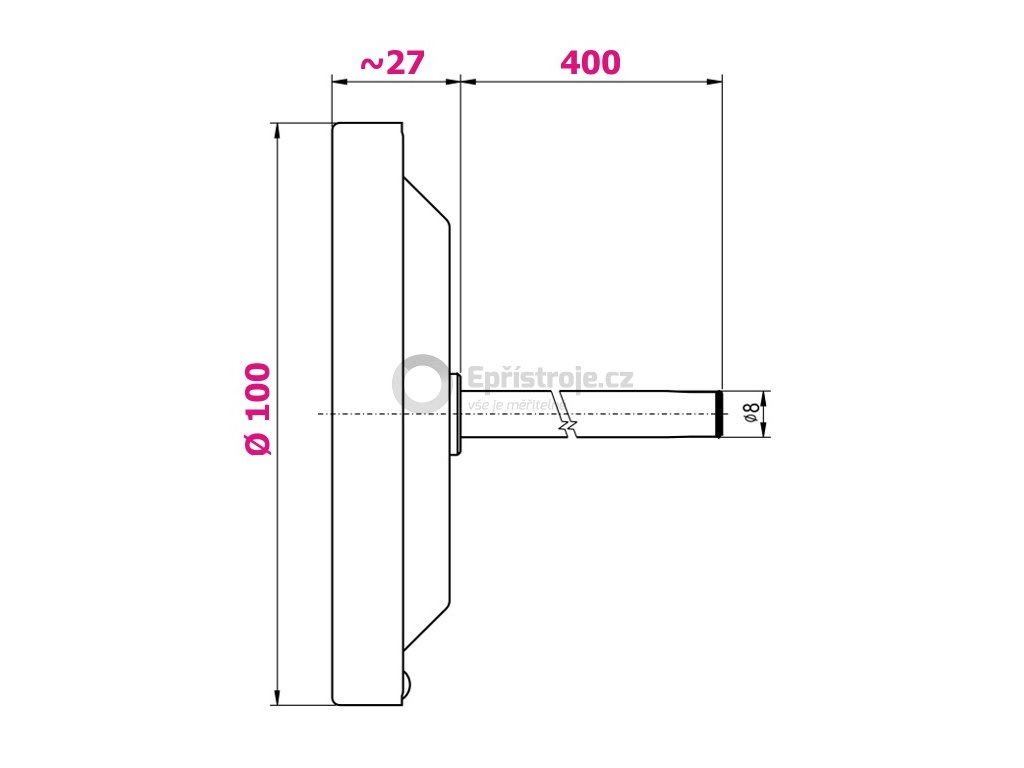 - délka měřicího stonku: 400 mm (zatavený nerezový stonek - možno použít bez jímky, stonek je kolmý ke stupnici)