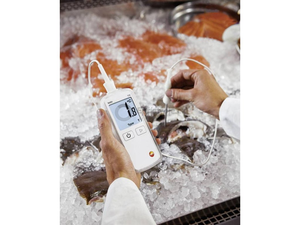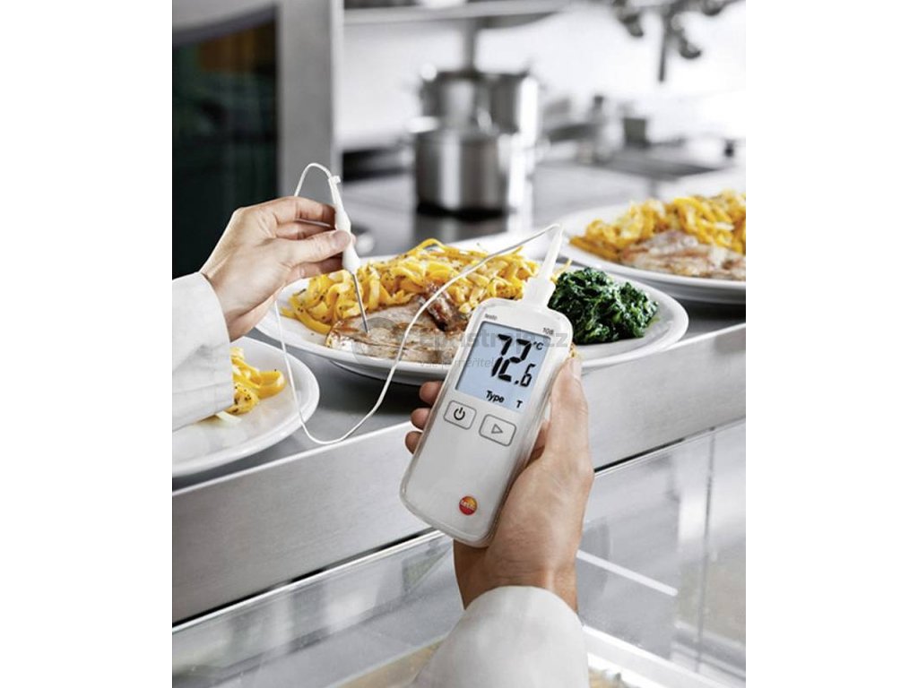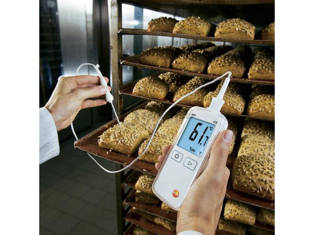 Pro namátková měření rychlostí sekundy s precizním výsledkem: vodotěsný potravinářský teploměr testo 108 umožňuje měření teploty při výrobě, zpracování a skladování potravin.