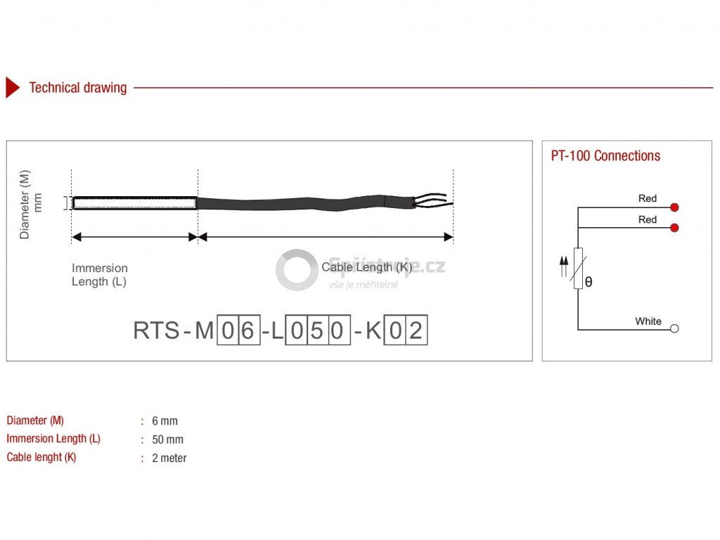 Teplotní snímač Emko RTS-M06-L050-K02 | typ senzoru Pt100 | -50 až +200 °C | kabel 2 m
