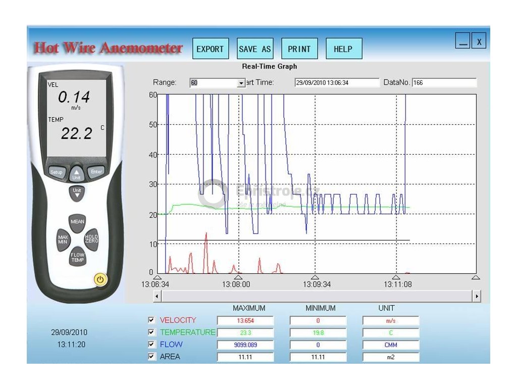 - Možnost měření objemového průtoku vzduchu po zadání plochy potrubí (potrubního kanálu)