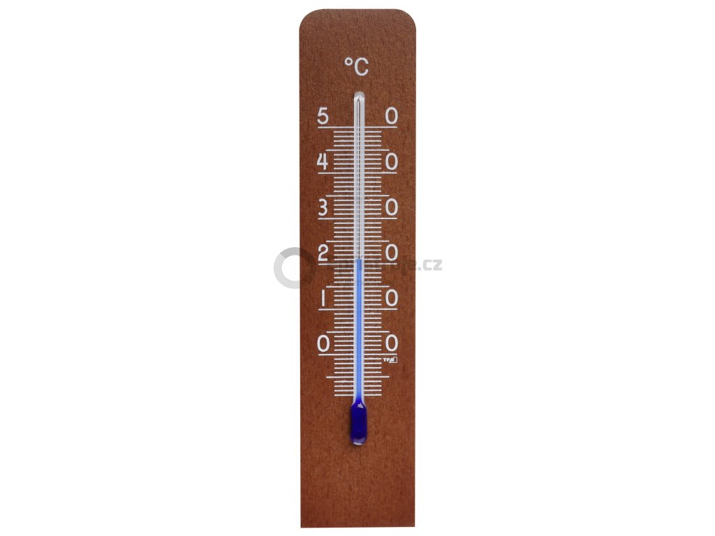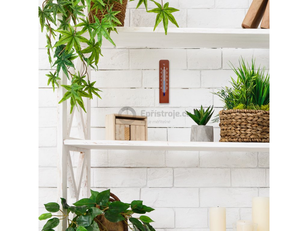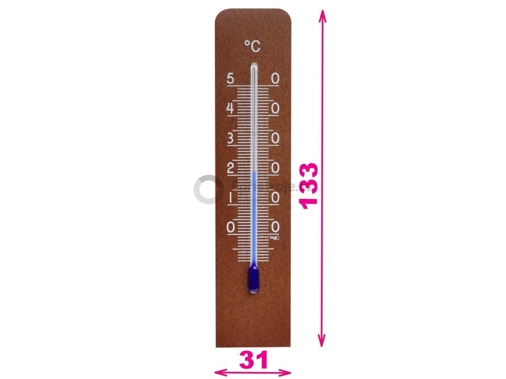 Dřevěný nástěnný teploměr pro měření teplot v interiérech. Bílá teplotní stupnice od -10 do +50 °C, skleněná kapilára s červenou ekologickou náplní.